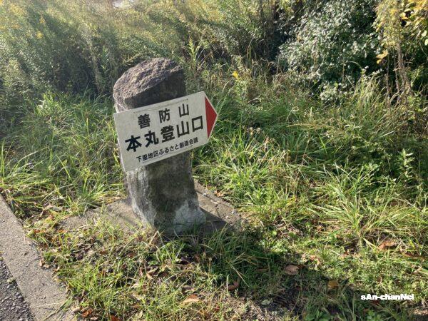 それぞれの登山口には道標があるのでわかりやすいです。10分程歩いて、8時45分に善防山本丸登山口につきました!ここからいよいよ山に入っていきます!