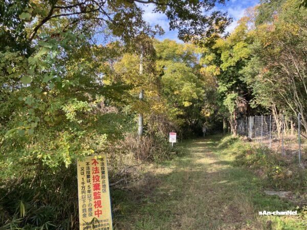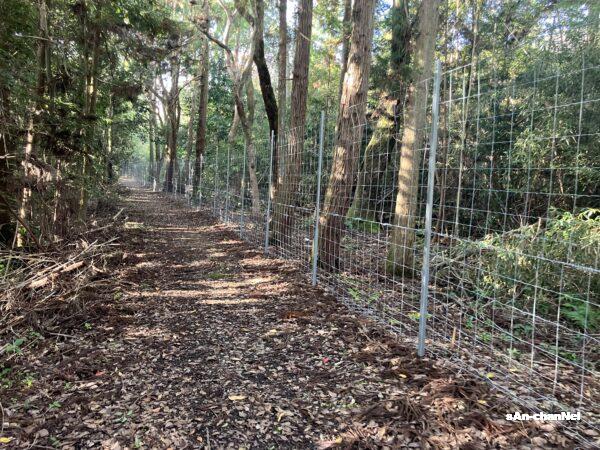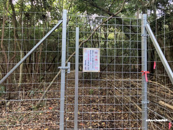 本丸登山口という名前からもわかるとおり、室町時代には山頂に善防山城があったそうです。よく整備された道を進んでどんどん山の中へ。右手に獣よけの柵があるのですが、昨今のアーバン熊頻出事件を思うとちょっとビビりますね。