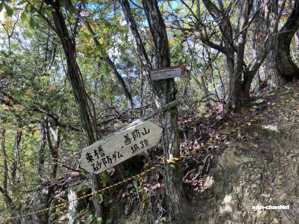 山頂をさす標識、そして善防山城址とも書かれています。こんな所にお城があったら、さぞかし攻めにくかったでしょうね!登城するのも大変だけど;