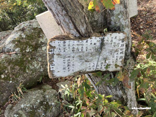 ここが城址だったよという事が書かれた看板もありますが、字が禿げたり褪せたりしていて読めない・・;