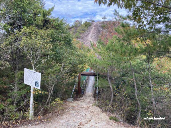 橋の手前に説明看板があって「切り通し参道の磨崖仏」と書かれています。この先に磨崖仏があるようです!さっそく橋を渡ってみましょう!