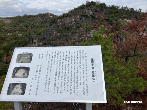 登った先にも看板があったので、そこまで少し横移動。達磨大師(磨崖仏)と書かれています。前方をよく見てみると・・その先に発見!
