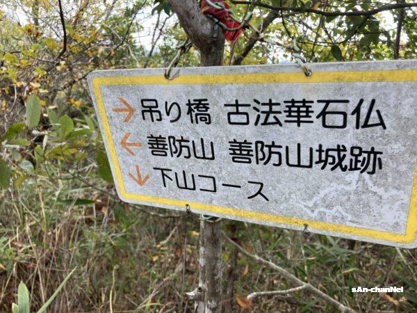 | 山行ルート | 善防公民館駐車場→善防山本丸登山口→善防山(ぜんぼうやま)標高:251m〜吊橋→古法華寺→馬の背コース登山口→馬の背→善防公民館駐車場 |